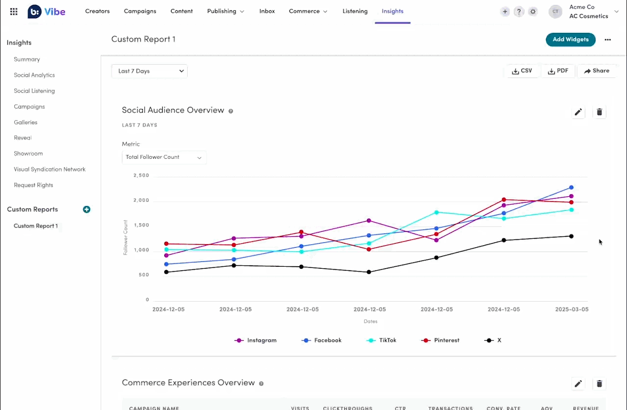 Bazaarvoice Vibe clients now have custom reporting dashboards – centralized measurement to prove real business impact – unified in Vibe. Mix and match metrics across sampling and creator campaigns, social channels and storefronts, and onsite galleries, to prove full-funnel impact, from engagement to revenue, all in one place.