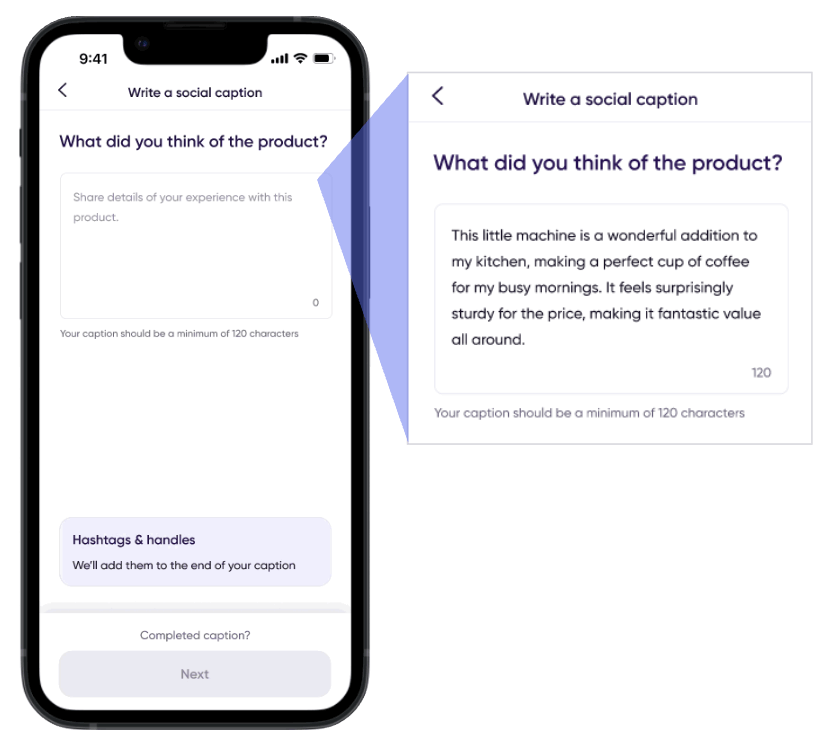 Now, sampling campaigns that generate social UGC require members to include a caption that meets a character minimum length. Further, captions are reviewed by AI to help ensure brand-safe content is generated.