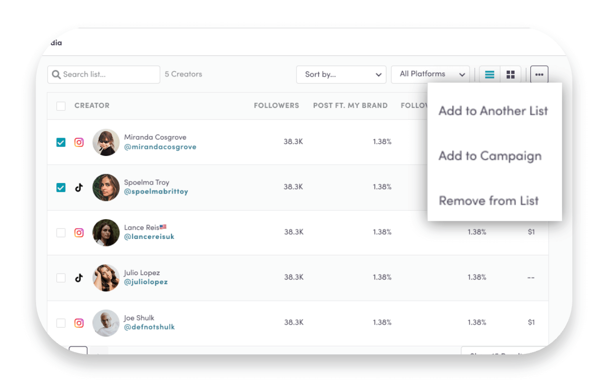 You can now bulk-delete creators and add them directly to campaigns from lists, making your transition from discovery to activation faster and more efficient.