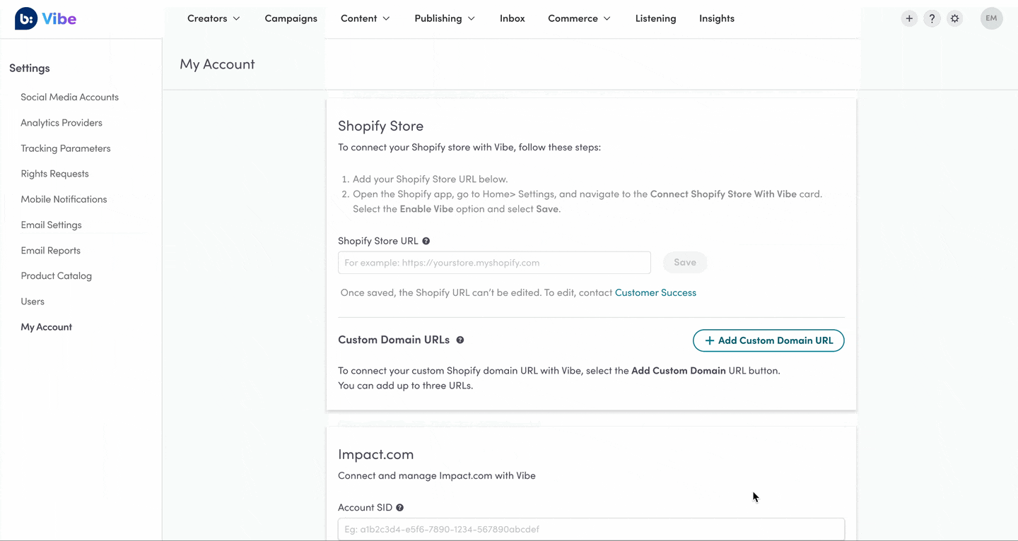 - Seamlessly Activate Affiliates: Onboard creators directly into your Impact.com program to manage, track, and scale these relationships—all without leaving Vibe.